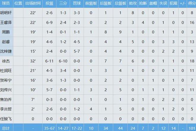 此役广东队多达五人得分上双,徐杰砍下全场最高的18分外加7板6助全面数据,胡明轩虽只得到8分但送出全场最高的8次助攻,赵睿13分4板5助,日后若想看到黑白矮并肩作战或许只能在国家队了。